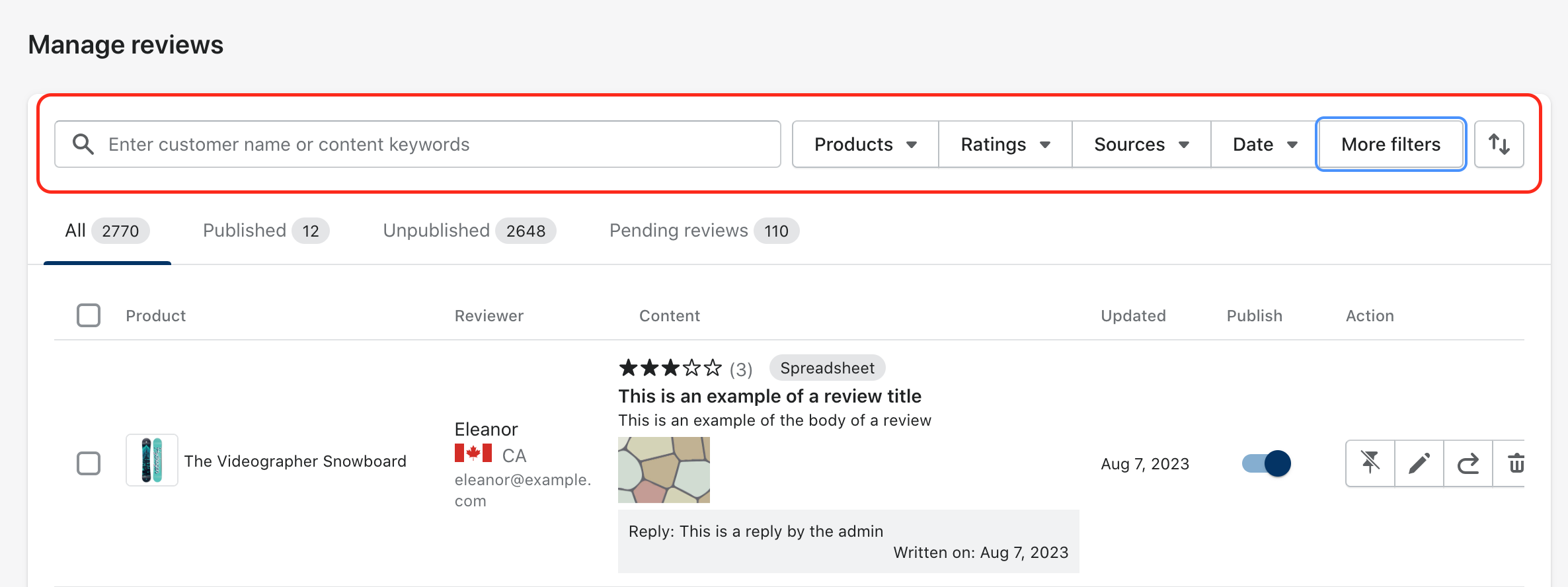 The default page of Manage Reviews will show all reviews which come from all sources of your store