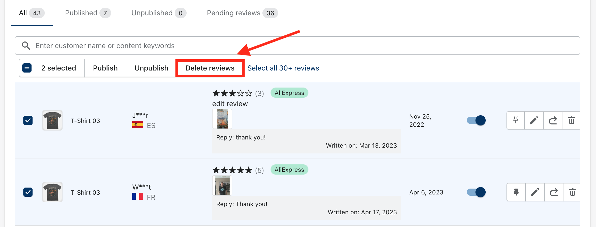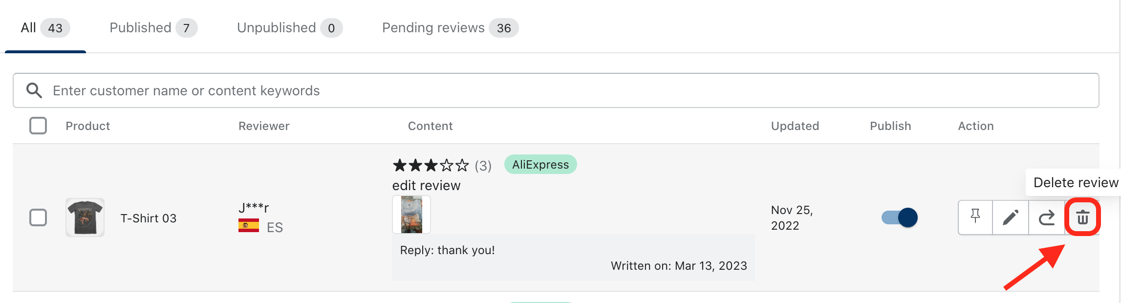 You can easily manage all the reviews on Manage Reviews section by filtering, sorting and searching.