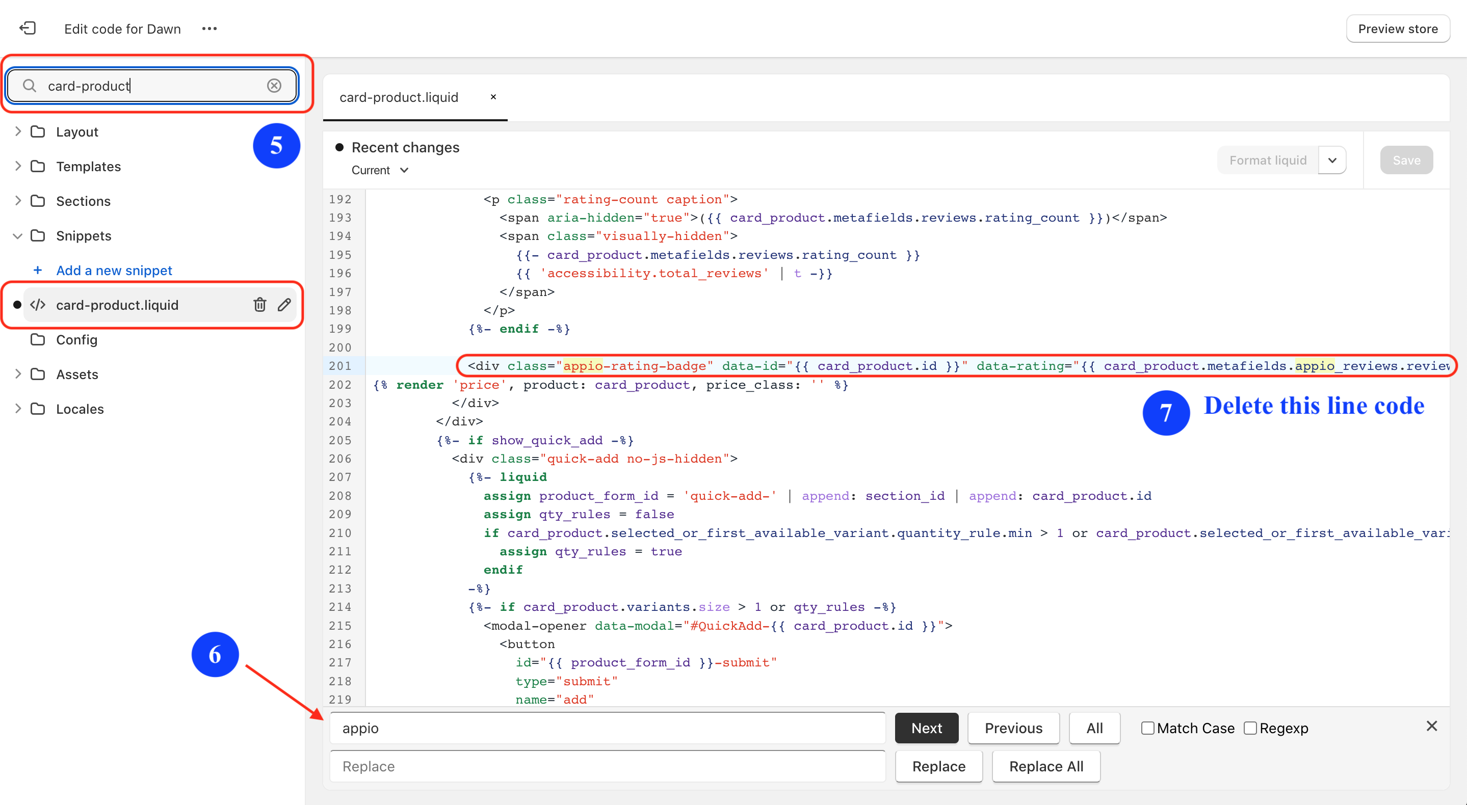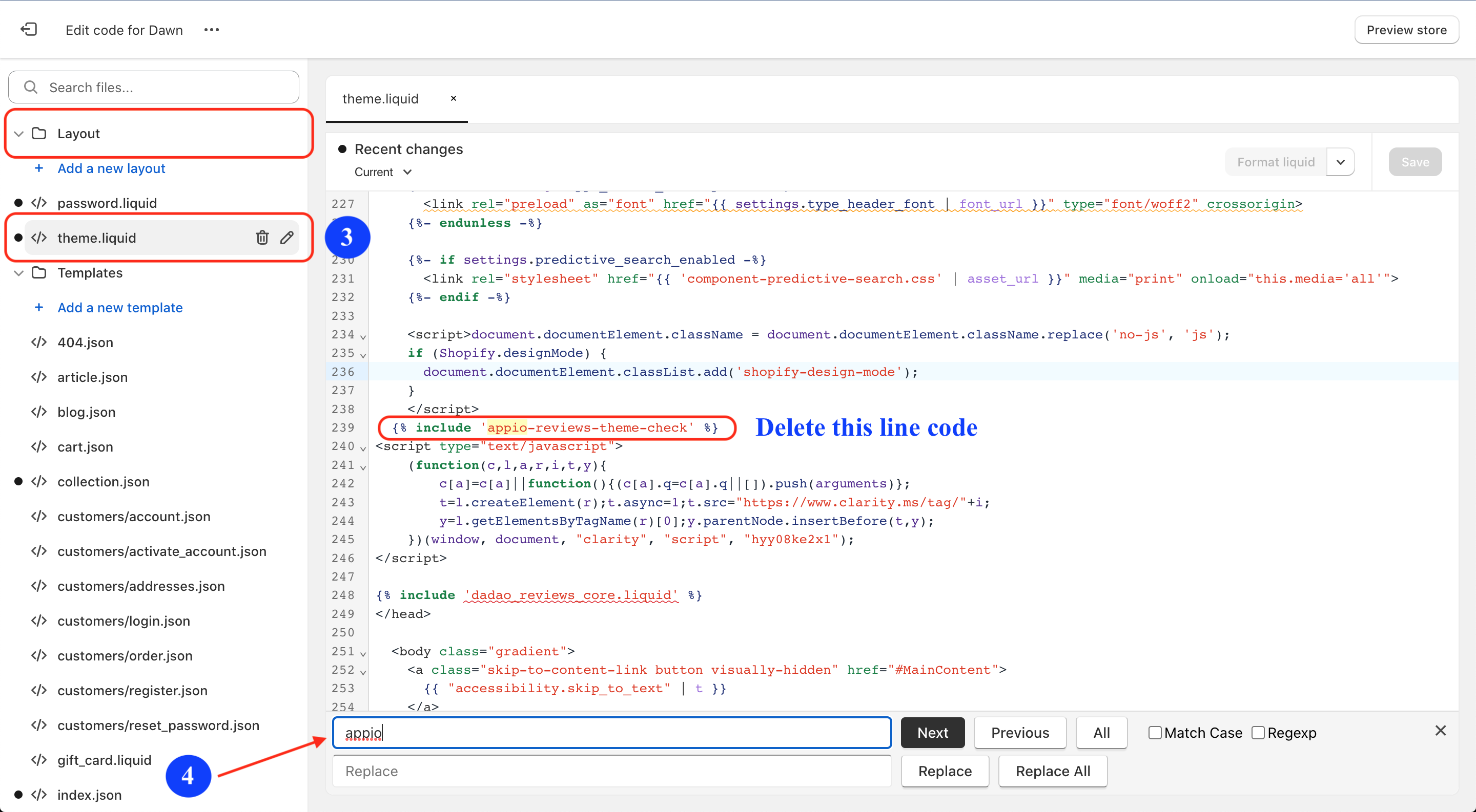 If you uninstall Appio Reviews app by mistake without using the "Remove code" button, some code will still be in your store, but it will not affect your store's performance. You can follow these steps to get rid of it: