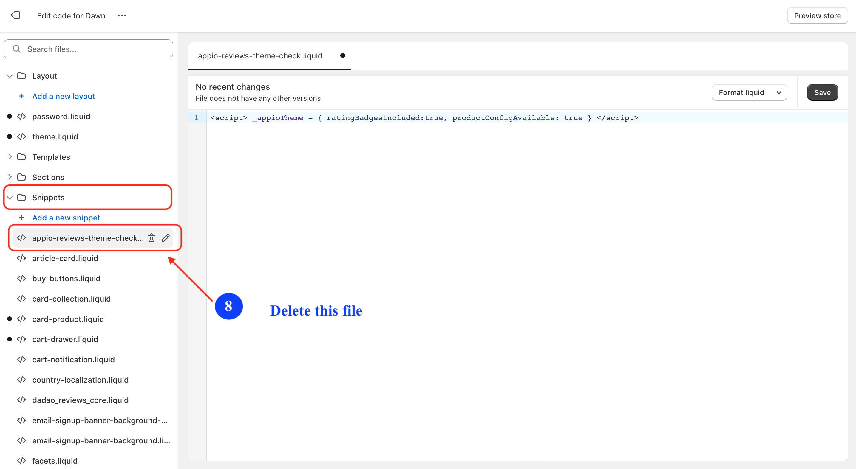Under Snippets folder, locate appio-reviews-theme-check.liquid then delete it