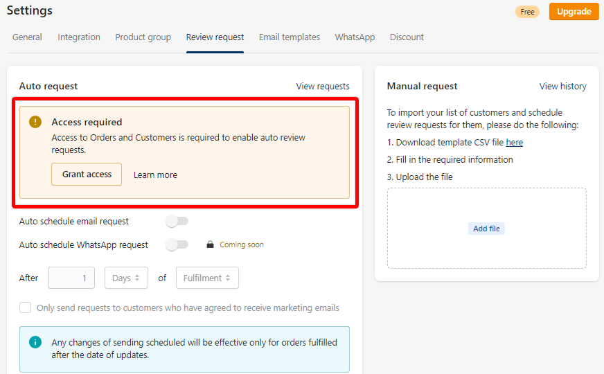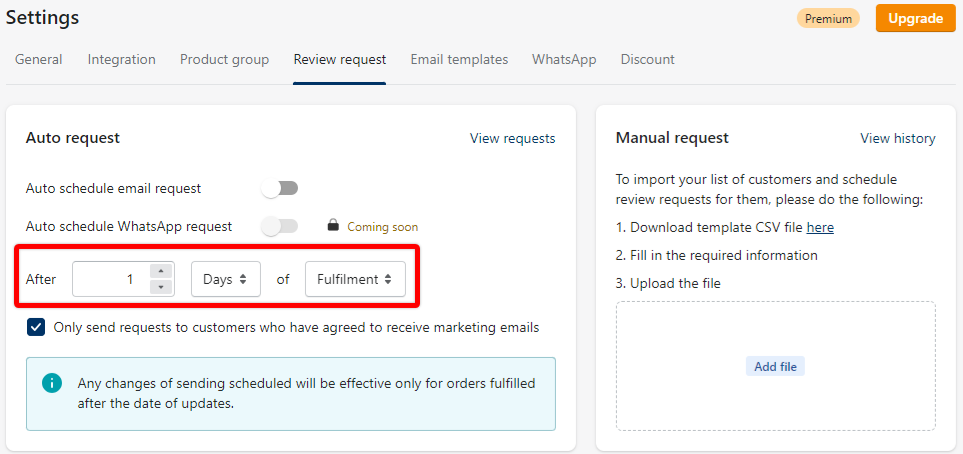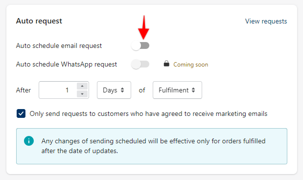 Once you activate the Auto schedule requests, you are now ready to adjust your sending schedule by hours/days based on Fulfillment or Purchase event.
