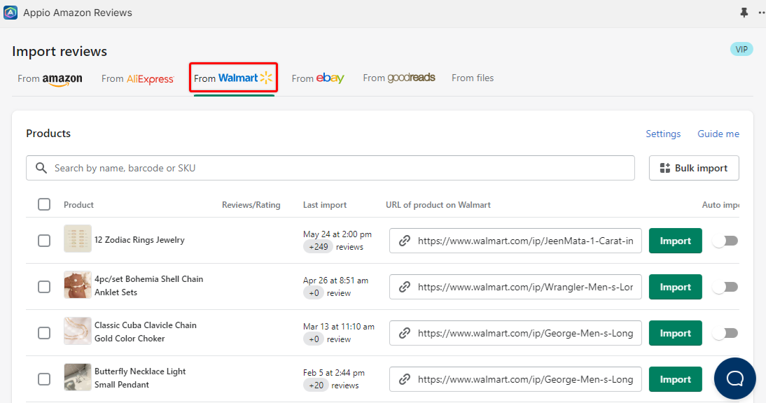 From product list below, paste the URL link of Walmart product you want to import then click Import