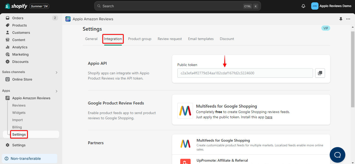 In the old store, go to Settings -> Integration -> Appio API -> Copy Public Token.