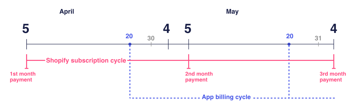 In the example below, the bill on May 5 includes the app subscription that overlaps from April 20-May 20. The bill on June 4th similarly includes the app subscription from May 20-June 19 (since May has 31 days).