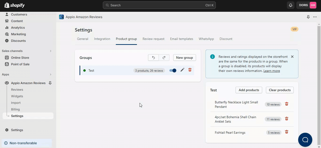 Product groups allow for the effortless sharing of reviews across various products. The ratings and reviews seen on the storefront are identical for all products within a review group. This feature proves beneficial when you offer similar items across distinct product pages.