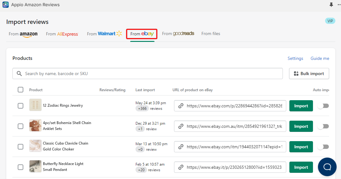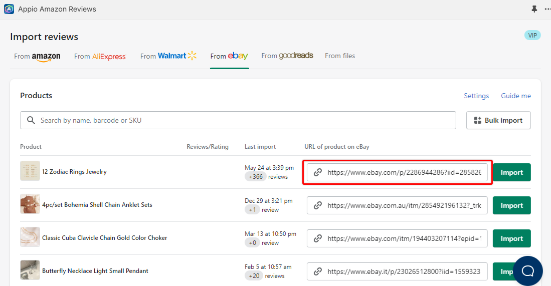 From product list below, paste the URL link of eBay product you want to import then click Import