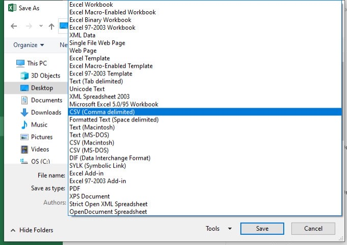 Save file as CSV format