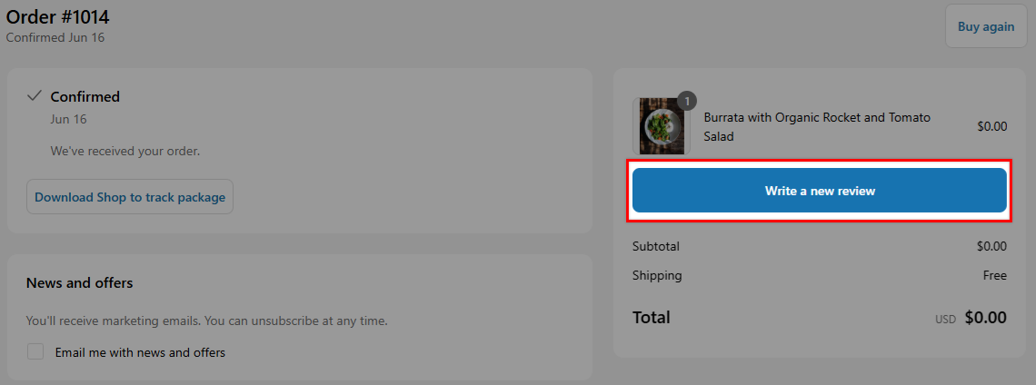 When a customer logs into their Shopify account and views their past orders, they’ll see a “Write a review” button below the product list they've purchased. Clicking this button opens a review submission form right on the same page. This streamlined experience encourages more feedback, as it doesn’t rely on email reminders or redirection to other pages.