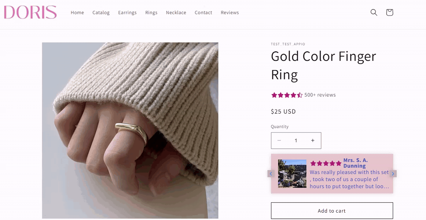 Reviews rotate automatically, keeping the product page engaging without overwhelming the layout.