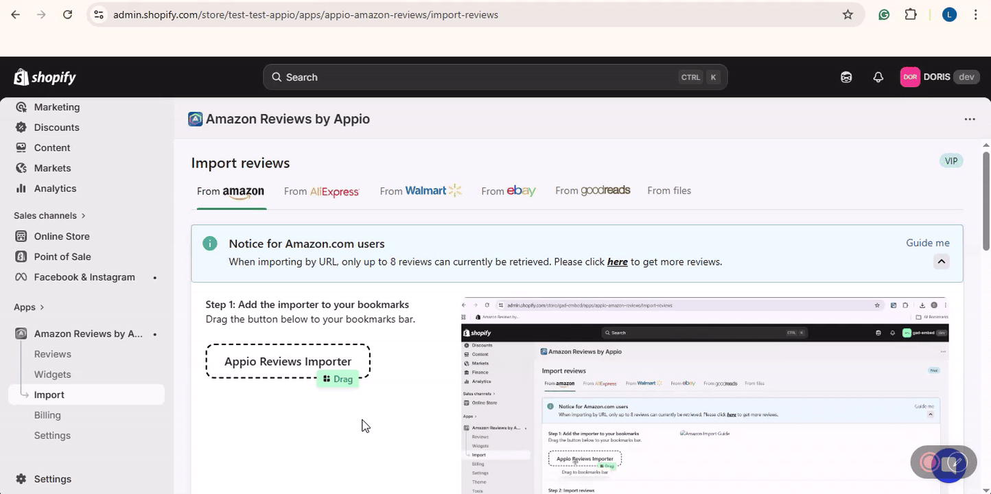 Drag and drop the Appio Reviews Importer button directly onto your bookmarks bar